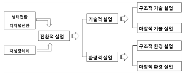 전환의 시대에 발생하는 실업을 전환적 실업(transitional unemployment)이라고 이름 붙인다면 이는 그 발생 원인에 따라 기술적 실업과 환경적 실업으로 나눌 수 있다. 또한 전환적 실업은 그 양태에 따라 일자리의 부족으로 발생하는 구조적 실업과 숙련이나 지역, 노동조건의 불일치(mismatch)로 발생하는 마찰적 실업으로 나뉜다(<그림> 참조). 전환적 실업이 노동시장의 약자인 하청 노동자나 비정규 노동자, 미조직노동자부터 희생양으로 삼으리라는 건 어렵잖게 짐작할 수 있다.