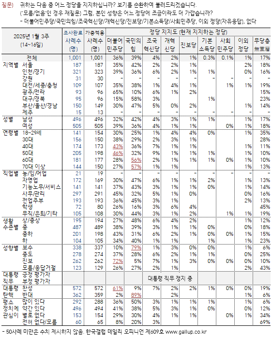 한국갤럽의 여론조사에서도 국민의힘 지지율이 급등하는 현상이 계속되고 있다. 한국갤럽이 2025년 1월 셋째 주(14~16일) 전국 만 18세 이상 유권자 1001명에게 현재 어느 정당을 지지하는지 물은 결과(표본오차 ±3.1%p, 95% 신뢰수준, 기타 자세한 사항 중앙선거여론조사심의위원회 홈페이지 참고) 국민의힘 39%, 더불어민주당 36%, 조국혁신당 4%, 개혁신당 2%, 진보당, 이외 정당/단체 각각 1%, 지지하는 정당 없는 무당(無黨)층 17%로 나타났다.