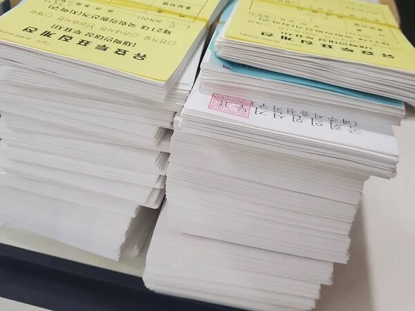 즉 위의 투표지는 앞서 살펴봤듯 회송용 봉투보다 길어지기 때문에 설사 관외사전 투표로 투표하더라도 반드시 접을 수밖에 없다. 게다가, 투표지 묶음 아래의 푸른 색 ‘집계전’ 종이를 보면 떡하니 ‘관내사전’에 체크되어 있다. 즉 봉투에 들어가지 않고 투표함에 바로 투입된 투표지들인 것이다.