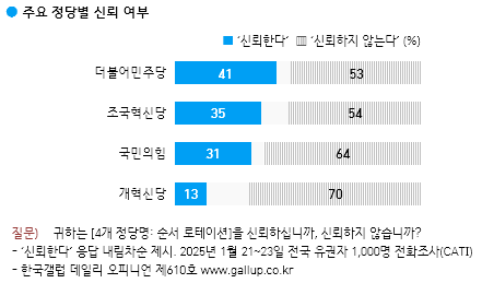 정당 지지도가 아닌 신뢰도를 묻는 한국갤럽의 다른 조사에서는 민주당에 대해 41%가 '신뢰한다'(이하 '신뢰'), 53%가 '신뢰하지 않는다'(이하 '비신뢰')고 답했고, 조국혁신당은 35%:54%, 국민의힘 31%:64%, 개혁신당 13%:70%로 나타났다. 민주당 지지자의 86%, 국힘당 지지자의 72%가 현재 지지하는 정당을 신뢰한다고 답했다. 진보층의 86%가 민주당을 신뢰했고 보수층의 85%가 민주당을 신뢰하지 않았다. 반대로 보수층의 58%만 국힘당을 신뢰했고 진보층의 95%가 국힘당을 신뢰하지 않았다. 성향 중도층에서는 민주당 신뢰:비신뢰가 각각 40%대로 비슷하게 나뉘었고, 국민의힘에 대해서는 71%가 신뢰하지 않았다.