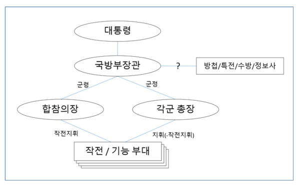 대통령의 국군통수권이 국방부장관을 경유하면서, 군령 사항은 합참의장에게, 군정 사항은 각 군의 총장에게 하달되지만 실제 시행할 작전/기능부대에서는 하나로 합쳐지는 분리 체계가 복잡해 보일 수도 있지만, 현대 전장의 특징인 지·해·공 작전공간의 중첩 및 합동작전의 필요성 증대에 대응하기 위해 대부분의 국방 선진국가에서 채택하고 있는 체계로, 우리도 1990년대 한국군 평시작전권 환수와 함께 현재의 통수권 체계를 유지하고 있습니다. 체계의 원래 목적은 아니었지만 군사 쿠데타 방지 측면에서, 대통령과 국방부장관 이외에는 누구도 군령/군정 양대 계선을 장악할 수 없기에 불법적 병력 동원 및 군사행동을 시도하기가 매우 어려운 구조입니다. 아울러 통수권체계 내에 구축된 촘촘한 정보화 시스템으로 쿠데타 성공의 필수 조건인 사전 비밀 유지가 거의 불가능하고, 특히 병영 내 개인 모두가 손에 스마트폰을 들고 있는 현실에서 일반 형태의 군사 쿠데타는 불가능할 것입니다.