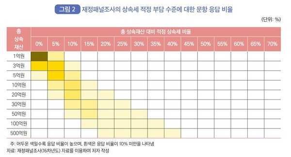 보고서를 보면 상속재산 3억 원에 대해 비과세(세율 0%)하자는 비율과 세율 5%를 선호한다는 비율이 비슷한 것으로 조사됐다. 상속재산의 액수가 적어도 어느 정도 세금을 내야 한다는 국민 인식이 깔린 것이다. 다만 상속재산 1억 원에 대해서는 비과세 답변이 우세했다.