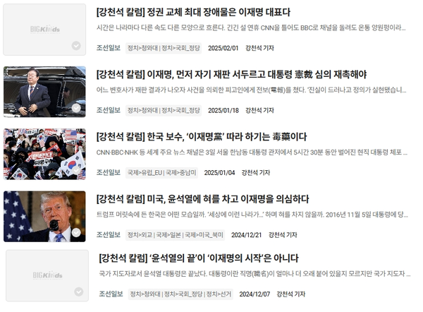 이 둘을 포함해 조선일보에서 내로라하는 필진은 이재명을 먹고 산다. 이번 주에도 강천석은 이재명을 들고나왔다. ‘정권 교체 최대 장애물은 이재명 대표다’. 언뜻 정권 교체를 염원하는 듯하지만 뻔한 속내를 들여다보기 어렵잖다. 두 달 가까이 강 씨가 심혈을 기울여 써온 칼럼 제목을 나열한다. ‘윤석열의 끝'이 '이재명의 시작'은 아니다(12.7). 미국, 윤석열에 혀를 차고 이재명을 의심하다(12.21), 한국 보수, '이재명당' 따라 하기는 독약이다(1.4), 이재명, 먼저 자기 재판 서두르고 대통령 헌재 심의 재촉해야(1.20). 2024년 12월부터 2025년 2월 1일까지 그의 칼럼 제목에는 이재명이 빠진 적 없다. 이재명대표의 위력이 느껴진다.