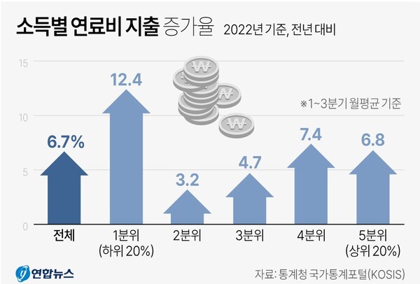 같은 기간 전체 가구의 연료비 지출 증가율은 평균 6.7%였다. 소득 상위 20%인 5분위 가구 6.8% 늘었다. 2분위는 3.2%, 3분위는 4.7%, 4분위는 7.4% 각각 증가했다.