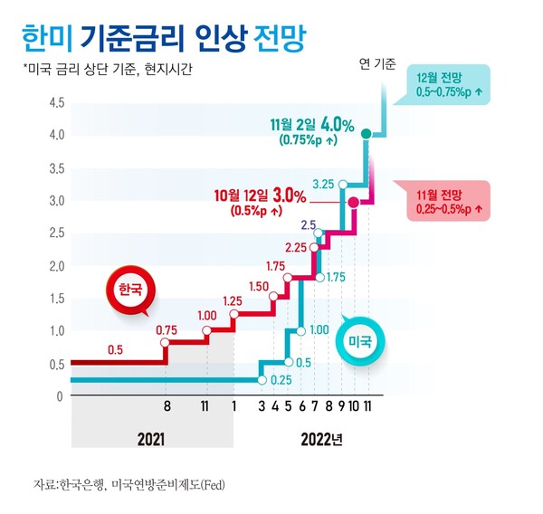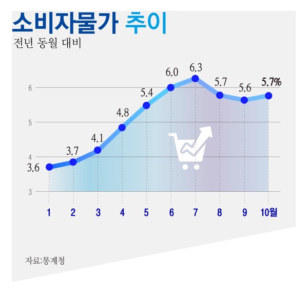 시중 장단기 금리와 예금 및 대출 금리 변동으로 이어지게 되는 기준금리는 윤 정부 출범 때 1.5%에서 2배 수준인 3.0%까지 올랐다. 이에 따라 가장 안전한 채권인 국고채(3년물) 금리도 6개월 동안 1%포인트 넘게 상승한 4%대 초중반을 기록했다. 서민 생활에 적용되는 금리는 이보다 훨씬 높은 수준을 보이고 있다. 더욱이 오는 24일 열리는 올해 마지막 금융통화위원회에서도 기준금리의 추가 인상이 불가피할 전망이다. 이달 초 미국 중앙은행인 연방준비제도가 이른바 자이언트 스텝(0.75%포인트 인상)을 단행해 한미간 기준금리 격차가 최고 1%포인트로 벌어졌기 때문이다. 이렇듯 대내외 여건상 무리하다 싶게 금리를 올렸음에도 불구하고 지난 10월 소비자물가는 5.7%나 올랐다. 윤 정부 출범 이후 6개월 동안 소비자물가는 줄곧 5~6%대의 고공행진을 계속하고 있다. 통화당국이 인플레이션을 관리하기 위해 금리를 올리면 물가상승 압력이 낮아진다는 경제원론이 현재 우리나라에는 통하지 않고 있는 셈이다.