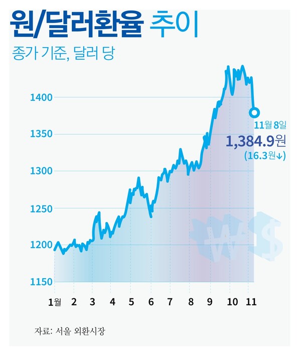 원/달러 환율 동향도 심상치 않다. 취임 초 등락을 보이며 조금 하락했던 원/달러 환율은 6월 이후 가파른 상승세를 보이며 달러당 1,200원대에서 1,400원대 중반까지 치솟기도 했다. 환율 상승은 기본적으로 수출 증가와 수입 감소로 이어진다. 하지만 지난 6개월 동안 환율 상승에도 불구하고 10월 수출은 오히려 지난해 같은 달 대비 5.7% 감소한 524억8천만달러를 기록했다. 이에 따라 연간 누적 무역적자 규모는 10월 현재 356억달러로 늘어났다. 전년 대비 수출이 감소한 것은 2020년 10월 이후 2년만이다.