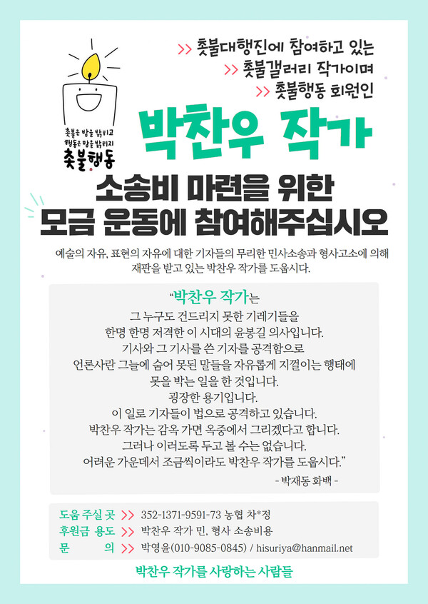 “어느 날 페이스북을 봤는데 ‘촛불행동’ 후원자분께서 자발적으로 저를 돕자는 운동을 하셨더라고요. 그분들의 도움으로 1심 변호사비를 냈는데 재판을 오래 하다보니 돈이 꽤 많이 듭니다. 민사 2심 때는 곽노현 교육감께서 김정환 변호사님을 소개해 주셨는데 감사하게도 형사, 민사 소송을 모두 무료로 변론해 주십니다. 몇달 전 ‘빨간 아재’라는 유튜브 채널 운영자인 박효석님께서 구독자 70만 돌파 기념으로 제가 소송을 당해 어려운 사정을 아시고 감사하게도 100만 원을 후원해 주셨습니다.”
