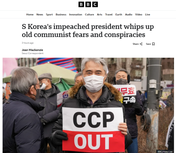 영국 BBC는 20일 '탄핵된 한국 대통령, 옛 공산주의 공포와 음모 부추겨'란 기사에서 이렇게 보고 "북한이나 공산주의에 관해 그다지 생각해본 적이 없는 사람들조차도 이제는 역동적 민주주의가 좌익 독재로 바뀌기 직전에 있고, 그들의 지도자는 평양과 베이징으로부터 자신들을 보호하고자 국민의 민주적 권리를 폐기하는 수밖에 없었다고 확신하고 있다"고 전했다.