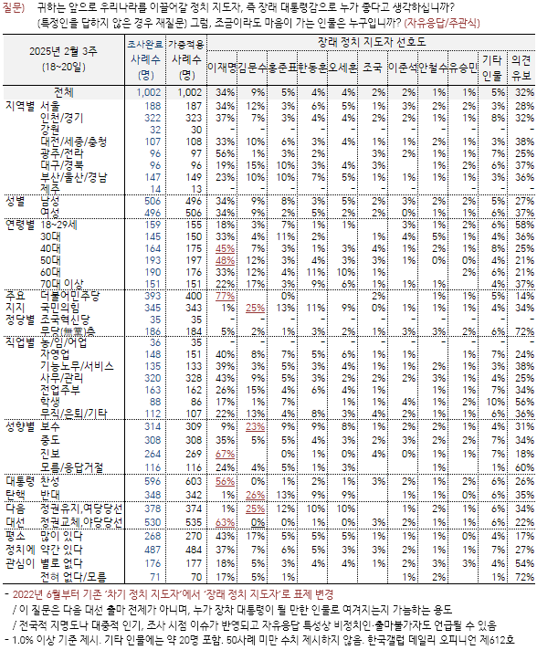 한국갤럽이 “우리나라를 이끌어갈 정치 지도자, 즉 장래 대통령감으로 누가 좋다고 생각하는지” 물은 결과(자유응답), 이재명 민주당 대표 34%, 김문수 고용노동부 장관 9%, 홍준표 대구시장 5%, 한동훈 전 국민의힘 대표, 오세훈 서울시장 각각 4%, 조국 전 조국혁신당 대표, 이준석 개혁신당 의원 각각 2%, 안철수 국민의힘 의원, 유승민 전 의원 각각 1% 순으로 나타났다. 5%는 이외 인물(1.0% 미만 약 20명 포함), 32%는 특정인을 답하지 않았다.