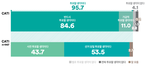 ‘투표할 생각이다’ 95.7% ‘사전투표할 생각’ 43.7%