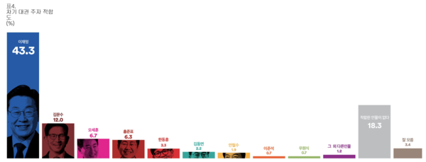 대선주자 적합도 이재명 43.3%, 김문수 12%