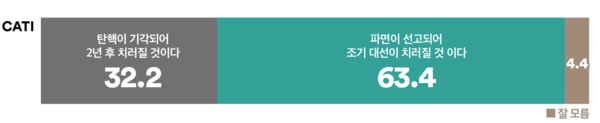 ‘여론조사꽃’이 2월 19~20일 전국 18세 이상 남녀 유권자 1010명을 대상으로 실시한 전화면접조사(표본오차 ±3.1%p, 95% 신뢰수준, 기타 자세한 사항 중앙선거여론조사심의위원회 홈페이지 참고)에서 차기 대통령 선거 시기에 대해 물은 결과 응답자의 63.4%가 ‘파면이 선고되어 조기 대선이 치러질 것’, 32.2%가 ‘탄핵이 기각되어 2년 후 치러질 것’이라고 응답했다. 양측 간 격차는 31.2%p였다.