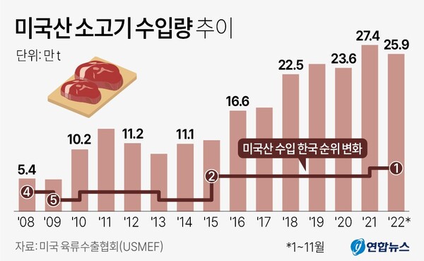 지난해 우리나라가 2021년에 이어 2년 연속 미국산 소고기를 가장 많이 수입한 나라로 기록될 것으로 보인다.