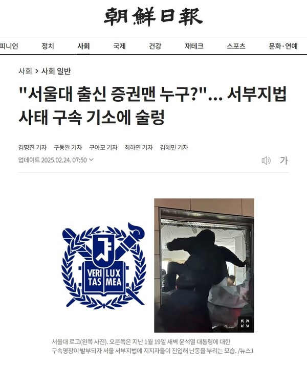 앞서 구아모 종업원은 2월 21일에 단독으로 ‘서울대 출신 여의도 증권사 직원, 서부지법 난입으로 구속’이란 기사를 올렸다. 서울대 상징과 법원 침탈 사진은 동일하다. 기사 내용도 별로 다르지 않다. 그러니 구아모 종업원이 나머지 4명의 동료에게 너그러움을 베푼 것으로 추정된다. 주말을 무료하게 보내는 대신 기자들 사이에 품앗이라는 소중한 전통을 몸소 실천한 아름다운 사례로 기억되겠다.