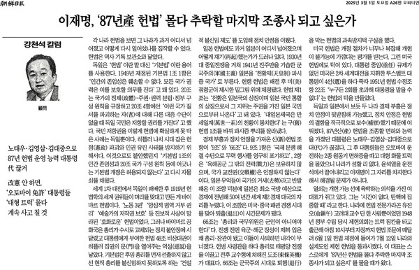당연히 민주 공화정을 말살하려던 윤석열의 내란을 옹호하는 조선일보는 말을 섞을 자격조차 없다. 강천석은 객쩍은 소리로 더 이상 민주 시민을 고문하지 말라. 강 씨는 오토바이, 대형 트럭 운운하더니 조종사와 추락 등 헛소리로 민주주의를 지켜낸 시민들을 현혹하려 들지 말라. 오토바이 면허도 없는 윤석열이란 자가 대한민국을 이 지경이 되도록 부추긴 자가 대체 누구인가? 민주 시민들이 나서 내란 세력을 몰아냈듯 헌법 개정도 그들 손에 맡겨라. 조선일보는 그 더러운 반역의 입을 당장 닥쳐라! 그리하여 다시 조선일보는 폐간만이 답이다.