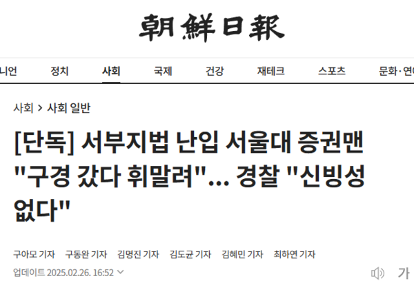 ‘동생과 단순 호기심으로 서부지법에 구경 갔다가 인파에 휘말렸는데 경찰 오해로 누명을 썼다’는 A씨의 말을 그대로 전하고 있다. 호기심으로 법원에 구경 갔다가 자의와 상관없이 인파에 휘말렸는데 경찰이 오해하여 누명을 썼다는 참으로 탄탄한 주장이다. 역시 서울대 출신은 어딘가 달라도 다르다. 이 정도라면 A씨의 말보다 자랑스런 그의 실명과 사진을 올려줌이 조선일보가 해야 할 막중한 책무 아닌가 한다. 조선일보식 보도에 따르면 문제는 경찰의 오해이고 무고한 서울대 출신 증권맨이 탄압을 받는지도 모른다는 것이다.