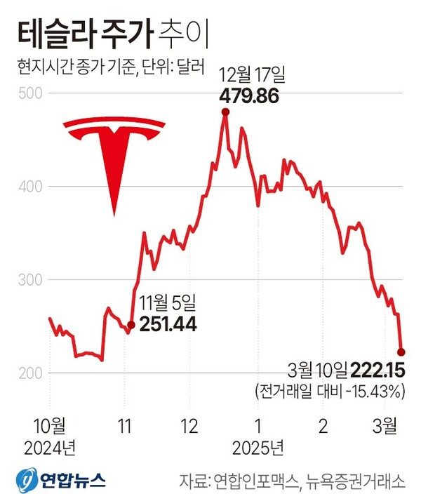 나스닥 지수의 하락 폭이 큰 이유는 테슬라를 비롯해 애플과 엔비디아, 메타, 마이크로소프트(MS), 알파벳(구글) 등 대형 기술 기업인 M7(매그니피센트7) 주가가 급락했기 때문이다. 특히 테슬라 주가가 15% 이상 추락하며 낙폭을 키웠다. 트럼프 대통령 당선 이후 테슬라 주가는 날개를 단 것처럼 급상승했다. 창업자인 일론 머스크는 한때 트럼프 행정부 2인자로 불리기도 했다. 테슬라 주가는 지난해 12월 17일에는 주당 479.86달러까지 올랐다. 그 이후 하락하기 시작해 10일엔 222.15달러로 거래를 마쳤다. 미국 대통령 선거 직전인 작년 10월 수준으로 돌아간 것이다.