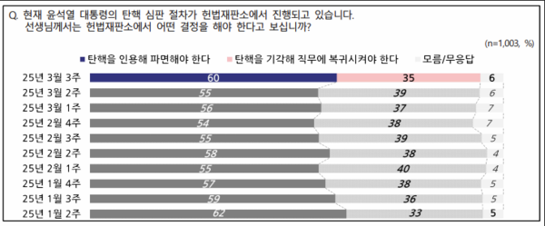 4개 여론조사 회사(엠브레인퍼블릭, 케이스탯리서치, 코리아리서치, 한국리서치)가 공동으로 진행하는 3월 3주차(17일~19일) NBS 여론조사에서 윤석열 탄핵 심판에 대해 헌법재판소에서 어떤 결정을 해야 한다고 생각하는지 질문한 결과, ‘탄핵을 인용해 파면해야 한다’는 비율이 60%로 나타났다. 전국 18세 이상 남녀 유권자 1003명을 대상으로 실시한 이 조사(표본오차 ±3.1%p, 95% 신뢰수준, 응답자 이념성향 진보 255 중도 321 보수 317, 기타 자세한 사항 중앙선거여론조사심의위원회 홈페이지 참고)에서 ‘탄핵을 기각해 직무에 복귀시켜야 한다’는 응답은 35%로 나타나 25%p 격차를 나타냈다. 진보(n=255), 중도(n=321)에서는 ‘탄핵 인용’(각각 88%, 72%)이 높은 반면, 보수(n=317)에서는 ‘탄핵 기각’(67%)이 높았다.