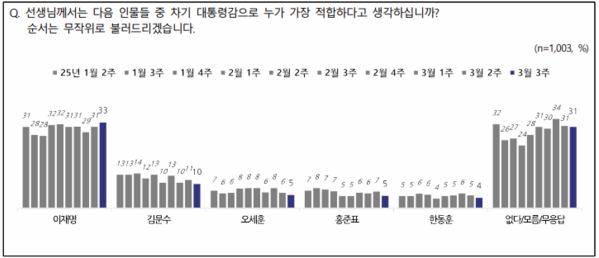 차기 대통령 적합도 관련, 차기 대통령감으로 가장 적합한 인물이 ‘이재명’이라는 응답이 33%로 가장 높았다. 지난주에 비해 2% 올랐다. ‘김문수’(10%), ‘오세훈’(5%), ‘홍준표’(5%), ‘한동훈’(4%) 등이 그 뒤를 이었는데 모두 합해도 ‘이재명’에 비해 9%나 부족했다(없다+모름/무응답) 31%).