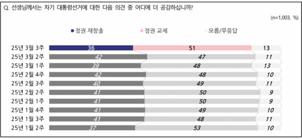 대선 구도 인식에 있어서도 ‘정권교체를 위해 야권 후보가 당선되어야 한다’고 응답한 비율이 51%로 지난주 47% 보다 4% 올랐고, ‘정권재창출을 위해 여권 후보가 당선되어야 한다’고 응답한 비율은 6% 떨어진 36%였다.