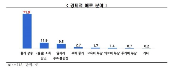 형편이 어려워진 이유로는 물가 상승이 71.9%로 가장 많았고, 소득감소(11.9%)와 일자리 부족 또는 고용 불안정(9.5%) 순이었다. 물가가 가장 크게 오른 분야는 ‘식료품과 외식비’라는 응답이 72.0%로 압도적으로 많았다. 에너지 비용(11.0%)과 주거비(4.5%), 공공요금(3.4%), 금융 이자 비용(2.5%) 등이 뒤를 이었다.