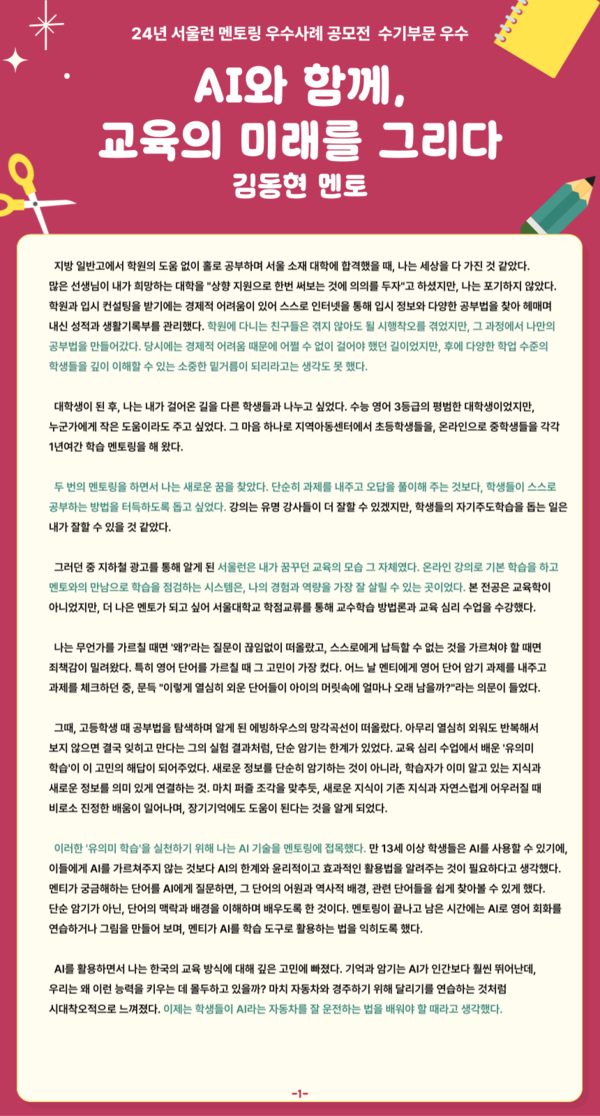 2024년 서울런 멘토링 우수 사례로 뽑힌 접근법은 이런 변화를 반영한다. 생성형 AI를 활용한 영어 학습 방법은 단순히 최신 기술을 교육에 도입하는 것이 아니라, 학생들이 스스로 도구를 활용해 배울 수 있는 능력, 즉 메타학습(meta-learning) 역량을 키우는 데 중점을 두었다.