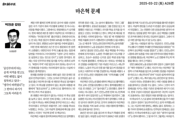마 재판관이 방 씨 조선일보의 유혹에 넘어가 ‘생각이 바뀌었다’는 쉬운 말을 하는 순간 바로 지옥이다. ‘생각’의 근거는 김문수 씨의 공산주의자라는 저격이 유일한 듯하다. 그렇다면 김문수 씨의 말은 진리라도 된다는 말인가? 박 씨는 김문수 씨의 말을 인용해 사상은 쉽게 바뀌지 않는다고 썼다. 그렇다면 그가 생각이 바뀌었다고 말하는 순간 방 씨 조선일보 종업원 박 씨가 무슨 짓을 하게 될지 뻔한다. 왜 생각이 바뀌었다고 말하라고 종주먹대는지 알 듯하다.