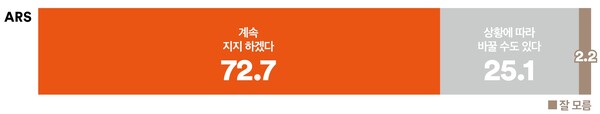 현재 지지하는 후보를 계속 지지할 것인지, 상황에 따라 바꿀 수도 있는지 여부에 대해, 응답자의 72.7%가 현재 지지하는 후보를 끝까지 지지하겠다고 응답했다. 반면, ‘상황에 따라 바꿀 수도 있다’는 응답은 25.1%로 집계돼, 10명 중 7명 이상이 지지 후보에 대한 입장을 굳힌 상태로 나타났다. 양자 간 격차는 47.6%p다.