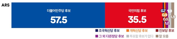 당선 가능성, 국힘 후보(35.5%)에 22.0%p 앞서