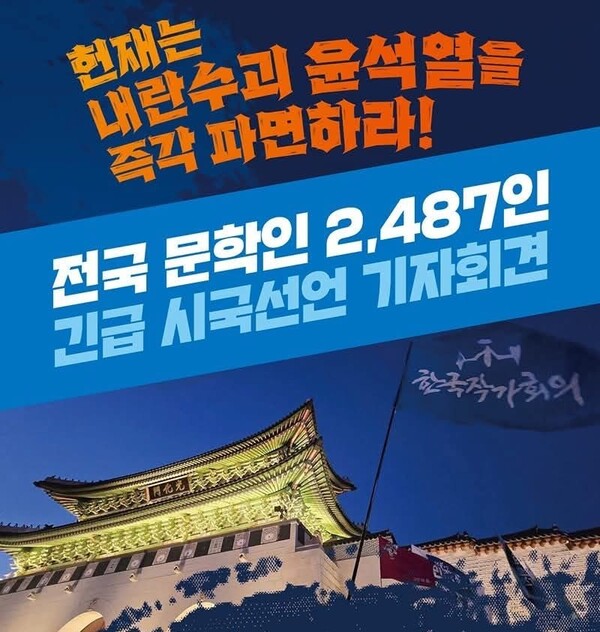 한국작가회의는 이와 별도로 이날 오후 광화문 농성촌 앞에서 문학인 2487명 명의로 '지금은 속도가 정의다. 헌재는 윤석열을 즉각 파면하라'는 제목의 긴급 시국성명을 발표했다.