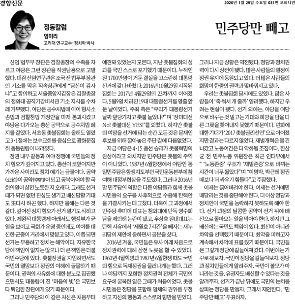 칼럼을 쓴 기자나 칼럼을 게재하기로 결정한 데스크가 이런 생각을 하지 않았을 리 없다. 의도적으로 민주당을 뺀 것이 아니면 다른 이유가 있을까? 5년여 전 경향신문에 실린 ‘민주당만 빼고’ 칼럼처럼, 민주당‘만’은 반드시 빼고 가자는 의도가 있었던 것은 아닐까? 과문한 탓에 다른 이유를 떠올리기가 어렵다.