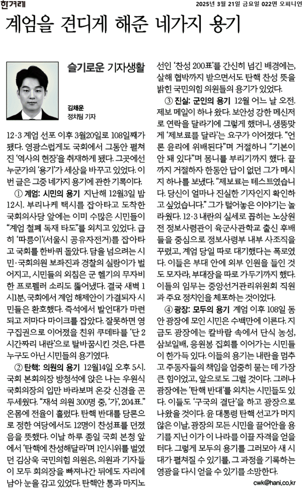 최근 한겨레 기자가 3월 21일자로 쓴 ‘계엄을 견디게 해 준 네가지 용기’ 제하의 칼럼(김채운 기자)도 같은 논란을 불러오고 있다. 한겨레 기자는 이 칼럼에서 지난 12.3 비상계엄 해제 이후 ‘세상을 바꾸고 있는 용기’로 네가지를 꼽았다, 첫째는 계엄 당시 국회에 모여 쿠데타를 막아낸 시민의 용기, 둘째는 윤석열 탄핵에 찬성표를 던진 국힘당 의원 12명의 용기, 셋째는 쿠데타 내용을 폭로한 군인의 용기, 넷째는 그동안 광장에 모인 시민들의 용기였다. 그러면서 “광장에 모인 탄핵찬성·탄핵반대 시민 모두를 끌어안을 용기를 지닌 이가 대통령 자격이 있다”고 주장했다.
