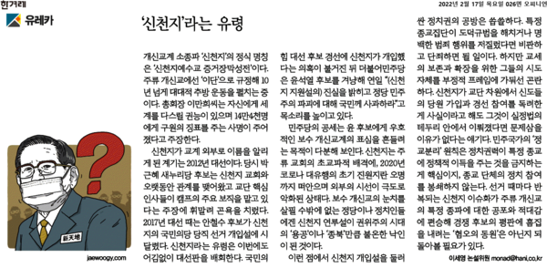 이번 ‘네가지 용기’ 칼럼처럼 반(反)민주당 논조를 확연히 느끼게 하는 기괴한 한겨레 보도가 또 있다. 대선을 앞둔 2022년 2월17일자 ‘유레카/신천지라는 유령’(이세영 기자)이라는 칼럼에서는 민주당을 비판하기 위해 신천지를 옹호하는 논리까지 등장한다. 사이비 종교로 알려진 신천지는 대선 때마다 국힘당 쪽 후보를 조직적으로 지원했는데, 민주당 이재명 후보가 윤석열 후보에게 ‘신천지 지원설의 진실을 밝히라’고 요구했다. 그러자 한겨레 기자는 “(민주당이) 윤 후보에게 우호적인 보수 개신교계의 표심을 흔들려는 목적이 다분해 보인다”며 의혹을 제기한 민주당 쪽에 문제를 제기했다.