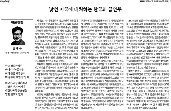 송 씨가 말하는 ‘낯선 미국에 대처하는 한국의 급선무’는 간단하다. 대한민국 국민이 나서 미국이 내세우는 범인류적 보편적 가치를 뭉개버린 윤석열 정부를 당장 몰아내는 일이다. 그리하여 미국이 소중히 여기는 자유, 인권, 민주, 법치를 바로세워야 한다. 비상계엄을 가장한 내란 지지 세력을 발본색원하는 것도 한국의 급선무이다. 자랑스러운 민주 정부를 세워 미국에 희망을 주는 것이 대한민국이 미국에 보여줄 급선무다. 내란 핵심 세력 방 씨 조선일보도 철저히 조사하여 죄를 묻는 일도 소홀히할 수 없다. 그리하여 다시 조선일보는 폐간만이 답이다.