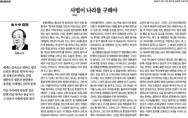 목사의 탈을 쓰고 하나님을 희롱하는 전광훈 따위의 인간을 제외한 대한민국의 모든 정상적인 국민은 윤석열 탄핵을 당연시하던 2025년 1월 21일, 조선일보의 대표 논객이라는 김대중 전 주필은 기명 칼럼에서 이렇게 썼다.