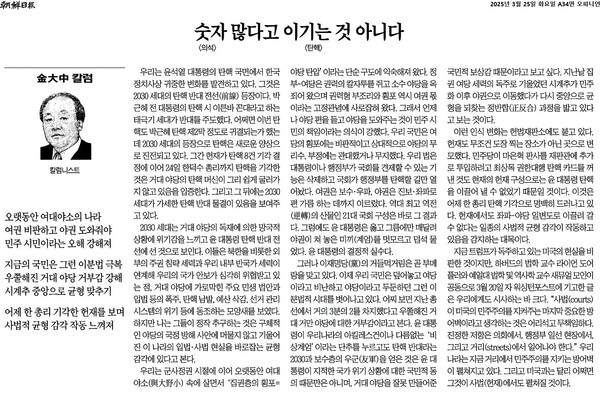그게 전부가 아니다. 윤석열 검찰 대 이재명의 선거법 소송의 항소심 선고가 있기 하루 전인 3월 25일의 칼럼에서 김대중 전 주필은 “2030 세대는 거대 야당의 독재에 의한 망국적 상황에 위기감을 느끼고 있고, 2030과 보수층의 윤석열 탄핵 반대는 거대 야당을 잘못 만들어준 국민적 보상감 때문”이라며 확증편향에 사로잡힌 아전인수의 요설을 늘어놓더니 숫자가 많다고 이기는 건 아니라며 보수성향의 헌재 재판관들을 향해 윤석열 파면을 막으라는 지령을 내린다.