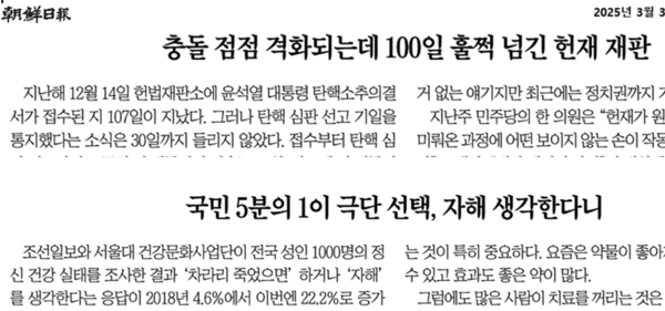 헌재의 윤석열 대통령 탄핵 심판 선고가 늦어지면서 사회적 불안과 갈등이 고조됐고, 거의 모든 신문들은 헌재의 조속한 판결을 촉구해 왔다. 헌재의 선고로써 사회적 혼란을 방지해야 한다는 논조를 펼쳐 왔다. 이 같은 논조는 중앙일보, 동아일보, 한국일보, 한겨레 경향신문 등 이른바 보수와 진보를 막론하고 공통적이었다. 그러나 지난달 25일 윤석열 대통령 탄핵 심판 최종 변론이 끝난 뒤 29일까지 한 달 넘는 기간 동안 사설을 통해 헌재의 조속한 선고를 요구하지 않은 거의 유일한 신문이 조선일보였다.