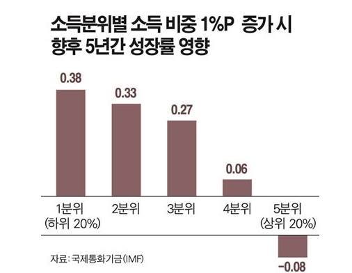 아래 표를 보면 소득 상위 20% 고소득층(5분위)의 소득이 전체 소득에서 차지하는 비중이 1% 포인트 높아지면, 향후 5년간 경제 성장률이 0.08% 후퇴하는 것으로 나타났다. 거꾸로 하위 20%(1분위)의 소득 비중이 1%포인트 증가하면, 5년간 0.38%의 경제 성장 효과가 생기는 것으로 집계됐다. 국제기구인 국제통화기금(IMF)이 1980년부터 2012년까지 전 세계 159개국의 소득과 경제성장 관련 자료를 토대로 실증 분석한 결과다.