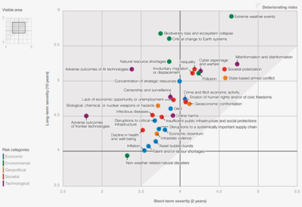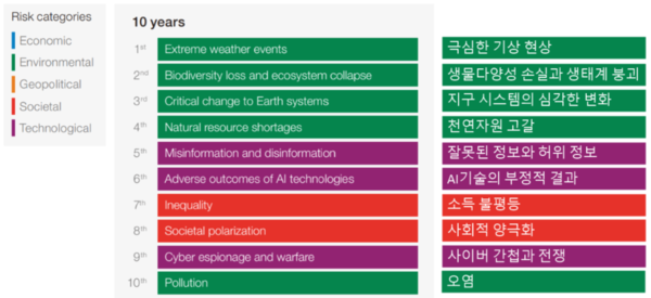 전 세계 학계, 비즈니스계, 정부, 국제기구, 시민사회에 종사하는 약 900명의 전문가들을 대상으로 2024년 9월 2일에서 10월 18일 조사해 얻은 답변에 따르면 1위 ‘극심한 기상현상(Extreme weather events)’, 2위 ‘생물다양성 손실과 생태계 붕괴(Biodiversity loss and ecosystem collapse)’, 3위 ‘지구 시스템의 심각한 변화(Critical change to Earth systems)’, 4위 ‘천연자원 고갈(Natural resource shortages)’이었다. 지금 겪는 산불이 바로 1위로 뽑힌 ‘극심한 기상현상’ 중 하나다. 이 보고서는 10년 뒤 위험을 2년 뒤의 위험과 비교했다.