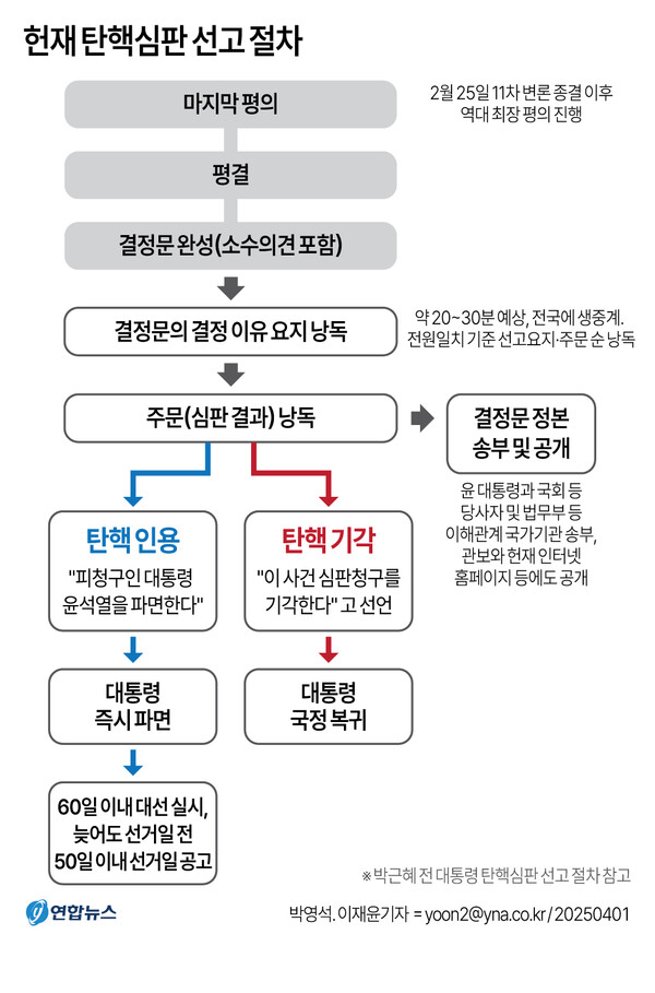 노무현·박근혜 전 대통령 탄핵심판 선고 당시에는 주문을 낭독하기까지 각각 28분, 21분 걸렸다. 전례를 고려하면 윤 대통령도 주문을 읽는 데 20여 분이 걸릴 것이라는 관측이 나온다. 선고는 문형배 헌재소장 권한대행이 결정을 담은 주문을 낭독하는 순간 효력이 발생한다. 기각이나 각하 주문을 읽는 즉시 윤 대통령은 직무에 복귀하며, 파면되면 곧바로 대통령직에서 물러난다.