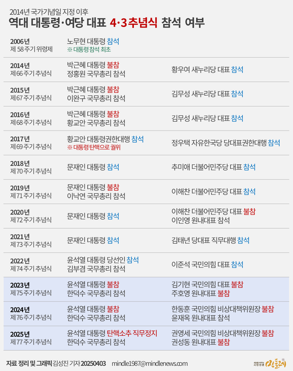 올해 77주기 4·3 추념식 역시 마찬가지다. 윤 대통령이 국회의 탄핵소추로 직무정지되면서 3년 연속 한덕수 대통령 권한대행 겸 국무총리가 정부를 대표해 제주를 방문했지만, 여당 지도부인 권영세 비상대책위원장과 권성동 원내대표까지 모두 불참하면서 또다시 완전히 제주를 외면했다. 아울러 대통령과 여당 지도부가 3년 연속 동반 불참하는 최악의 '출석표'를 기록했다.