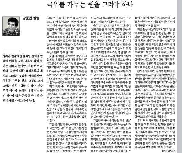 강 교수는 <조선일보>와 만나서는 민주 진보 진영에 대한 독설을 쏟아내 <조선일보>로부터 사랑을 받는 인물이다. 그러면서도 <한겨레>에는 점잖게 공자 말씀을 늘어놓는 칼럼을 쓰면서 ‘진보 지식인’이라는 호칭을 유지한다. 두 대척점에 서 있는 언론사를 한 몸에 ‘통합’시키고 있는 것이다. 참으로 능란한 처세술이다. 하지만 이런 책략이 정부 차원에서 가능할까? 아니 윤석열 이후를 책임져야 하는 정권이 취해야 할 전략일까?