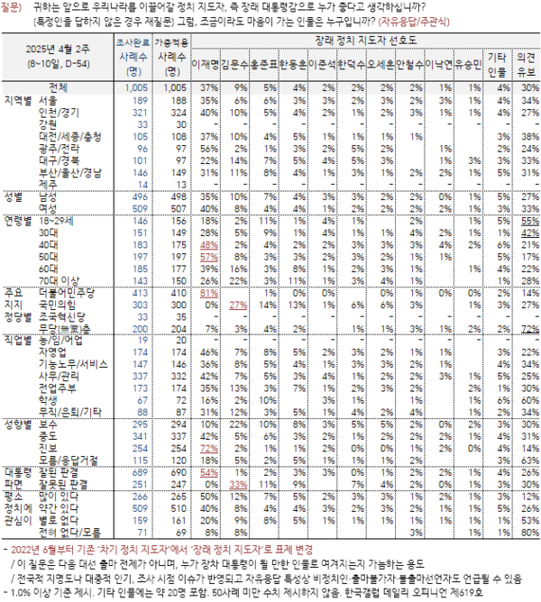 6월 3일 이루어질 차기 대선의 향배를 가늠할 수 있는 질문, 즉 장래 대통령감으로 누가 좋다고 생각하는지 물은 결과(자유응답), 이재명 전 더불어민주당 대표 37%, 김문수 전 고용노동부 장관 9%, 홍준표 대구시장 5%, 한동훈 전 국민의힘 대표 4%, 이준석 개혁신당 대선 예비후보, 한덕수 대통령 권한대행 국무총리, 오세훈 서울시장, 안철수 국민의힘 의원 각각 2%, 이낙연 전 국무총리, 유승민 전 의원 각각 1% 순으로 나타났다. 4%는 이외 인물(1.0% 미만 약 20명 포함), 30%는 특정인을 답하지 않았다.