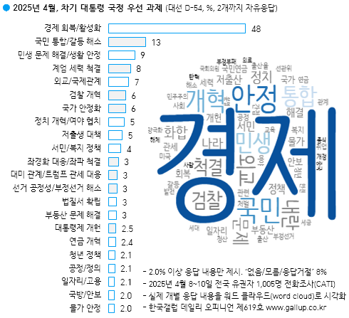 누가 되든 차기 대통령이 우선적으로 해결해야 할 과제는 무엇이라고 생각하는지 물은 결과(2개까지 자유응답). 절반가량이 '경제 회복/활성화'(48%)를 바랐고, 그 다음은 '국민 통합/갈등 해소'(13%), '민생 문제 해결/생활 안정'(9%), '계엄 세력 척결'(8%), '외교/국제관계'(7%), '검찰 개혁', '국가 안정화'(이상 6%), '정치 개혁/여야 협치', '저출생 대책'(이상 5%), '서민/복지 정책'(4%), '좌경화 대응/좌파 척결', '대미 관계/트럼프 관세 대응', '선거 공정성/부정선거 해소', '법질서 확립', '부동산 문제 해결'(이상 3%) 순으로 나타났다.