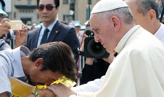 당시 정치적 중립을 위해 노란 리본을 떼는 게 좋다는 이들의 말씀을 듣고 교황께서는 “인간의 고통앞에 중립은 없다” 며 단호하게 거절하셨습니다. 제가 46일 힘든 단식을 하고 있을 때 한국 모 추기경은 유가족이 양보해야 한다며 박근혜 손을 잡았습니다. 하지만 프란치스코 교황은 언제나 그러하셨듯 약자인 저희들의 손을 잡아 주셨습니다.