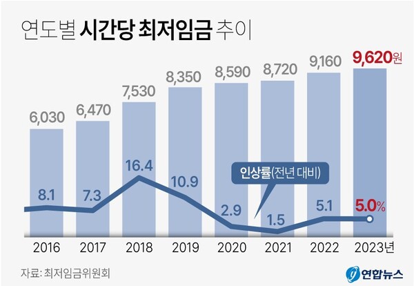 한국의 시간당 최저임금은 2020년 8590원에서 2021년 8720원으로 1.5% 올랐다. 이어 지난해에는 9160원으로 5.05% 상승했다. 2년간 6.6% 오른 셈이다.