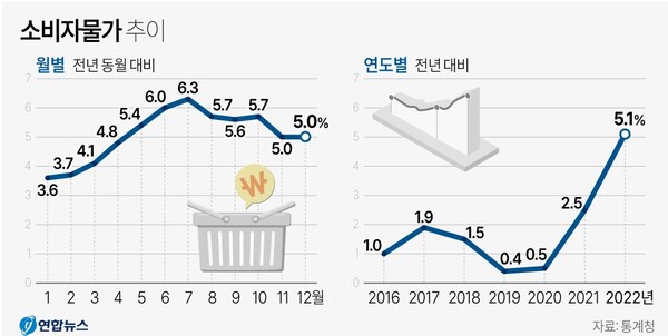 그러나 이 기간 소비자물가 상승률은 2021년 2.5%에 이어 지난해 5.1%로 집계돼 2년간 7.7%나 오른 것으로 나타났다.