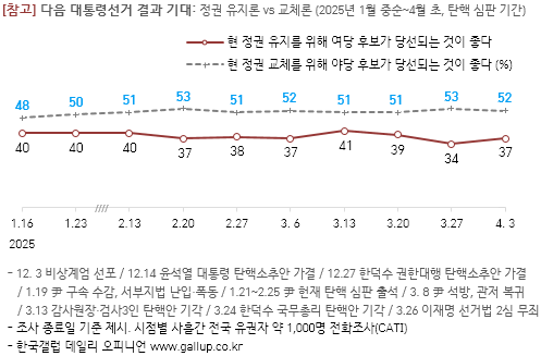 한국갤럽이 2025년 4월 넷째 주(22~24일) 전국 만 18세 이상 남녀 1005명을 대상으로 전화조사원 인터뷰(CATI) 방식으로 실시한 장래 정치 지도자 선호도 조사(표본오차: ±3.1%p 95% 신뢰수준, 응답자 이념성향: 보수 348 중도 287 진보 258, 기타 자세한 사항은 중앙선거여론조사심의위원회 홈페이지 참고) 이재명 전 더불어민주당 대표 38%, 한동훈 전 국민의힘 대표 8%를 기록했다. 이어 홍준표 전 대구시장 7%, 한덕수 대통령 권한대행 국무총리, 김문수 전 고용노동부 장관 각각 6%, 이준석 개혁신당 대선 예비후보, 안철수 국민의힘 의원 각각 2%, 이낙연 전 국무총리, 조국 전 조국혁신당 대표, 김동연 경기도지사 각각 1% 순으로 나타났다. 3%는 이외 인물(1.0% 미만 약 10명 포함), 23%는 특정인을 답하지 않았다.