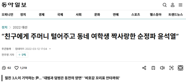 동아일보 전주영 기자는 윤석열 당선 직후인 2022년 3월12일 “친구에게 주머니 털어주고 동네 여학생 짝사랑한 순정파 윤석열”이라는 제목의 기사를 썼다. 이 미담(美談) 기사에는 윤석열이 ‘칸트 철학에 심취’ ‘양심의 명령대로 살아왔다’ ‘철학, 사회과학, 역사를 폭넓게 공부‘ ‘리더십이 강하고 보통 꼼꼼한 게 아니었다’는 등의 찬사가 담겨있다. ‘사시 9수’ ‘쩍벌남’ ‘열차 구둣발’ ‘술꾼’ 같은 윤석열에게 부정적 이미지가 이 기사에서는 모두 긍정으로 바뀌었다. 전주영 기자에게 묻고 싶다. 기자는 대통령 당선자를 미화하는 글을 쓰는 사람인가 감시 비판하는 사람인가?