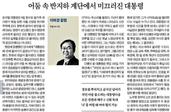 ‘윤비어천가’의 압권은 중앙일보 이하경 주필의 2022년 8월22일자 “어둠 속 반지하 계단에서 미끄러진 대통령” 칼럼이다. 윤석열이 침수피해를 입은 신림동 반지하 주택을 찾아가 둘러본 장면을 놓고 쓴 칼럼인데 “대통령이 만류를 뿌리치고 출입금지선인 폴리스라인을 넘어 어둠 속 계단을 걸어내려가 경호원들이 당황했”고 “도중에 미끄러져 넘어질 뻔했고 구두와 바지를 흙탕물에 적셨”다는 것이다. 그러면서 “대통령이 저 먹먹한 슬픔의 공간으로 몸을 밀어넣은 것은 국민의 아픔이 나의 아픔이라는 무한책임과 연대의 증거”라고 칭송했다.